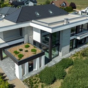 Wszystkie konstrukcje zostały zaprojektowane z myślą o precyzji: ukryte okucia, hartowane i laminowane szklenia o podwyższonej odporności, spójna kolorystyka antracytu, obecna nie tylko na profilach, ale również w wykończeniach, listwach, ramkach. To projekt, w którym nawet najdrobniejszy detal miał swoje uzasadnienie. Nawet kontraktrony – techniczny element systemu bezpieczeństwa – wpisują się w spójną narrację.