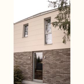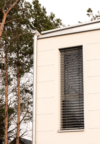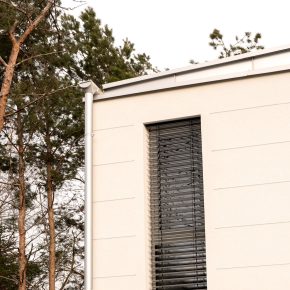 Montaż był trójwarstwowy, z wysunięciem okien w warstwę ocieplenia. Każdy detal – od taśm, przez fartuchy uszczelniające, po całkowicie kryte zawiasy – został zaprojektowany tak, by zachować spójność i lekkość bryły. To dom, który nie konkuruje z otoczeniem.